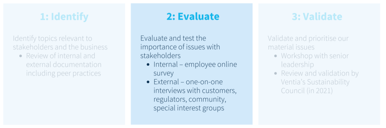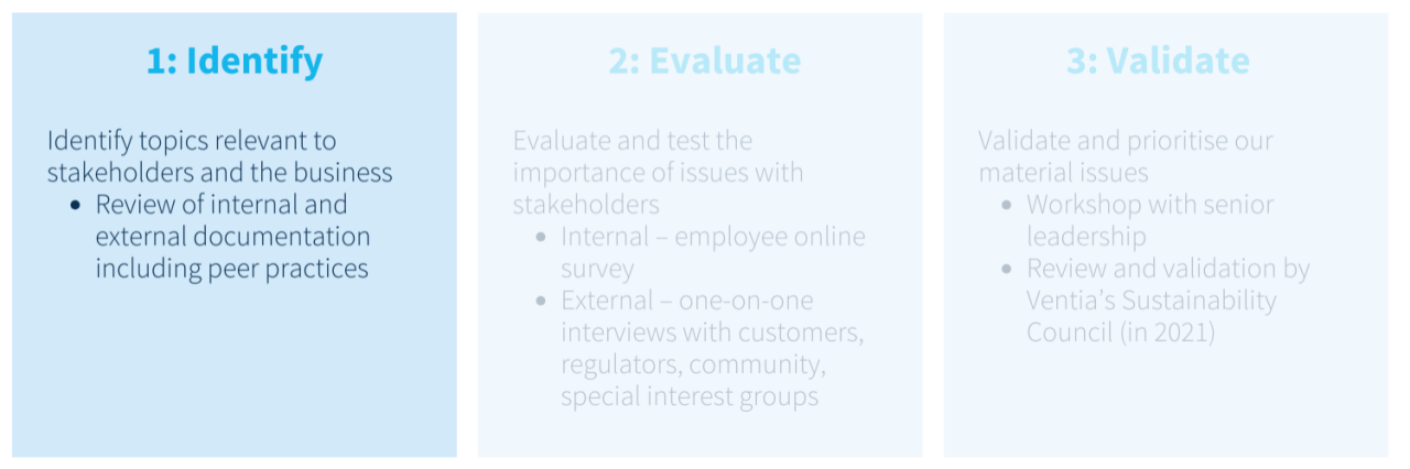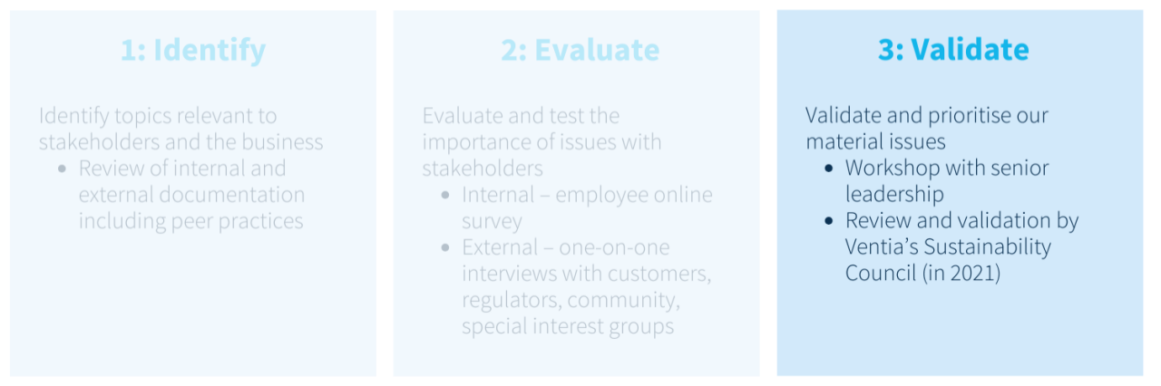 Ventia conducted a materiality assessment in 2020, supported by a third-party consultant to identify, evaluate and validate material ESG aspects for Ventia. The process included engagement with key stakeholders through surveys and interviews to determine high and very high materiality themes.
