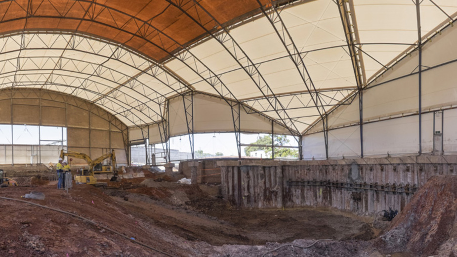 To protect the surrounding environment and the local community, we constructed a 2,600m2 environmental control enclosure (ECE). The ECE was constructed of steel trusses covered in a durable, weatherproof fabric and enclosed the primary excavation area. Contaminant emissions were captured in the ECE for treatment through a Ventia-designed Emission Control System (ECS). This system passed air extracted from the enclosure through a series of particulate and chemical filter membranes.